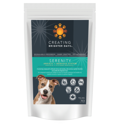 Serenity nutraceutical pet treats by Creating Brighter Daysâ„¢ promote calm, alleviate anxiety and nervousness, and balance the digestive tract. Calming ingredients such as ashwagandha and tulsi combat stress and decreases cortisol levels, while chamomile addresses uncomfortable digestive issues.